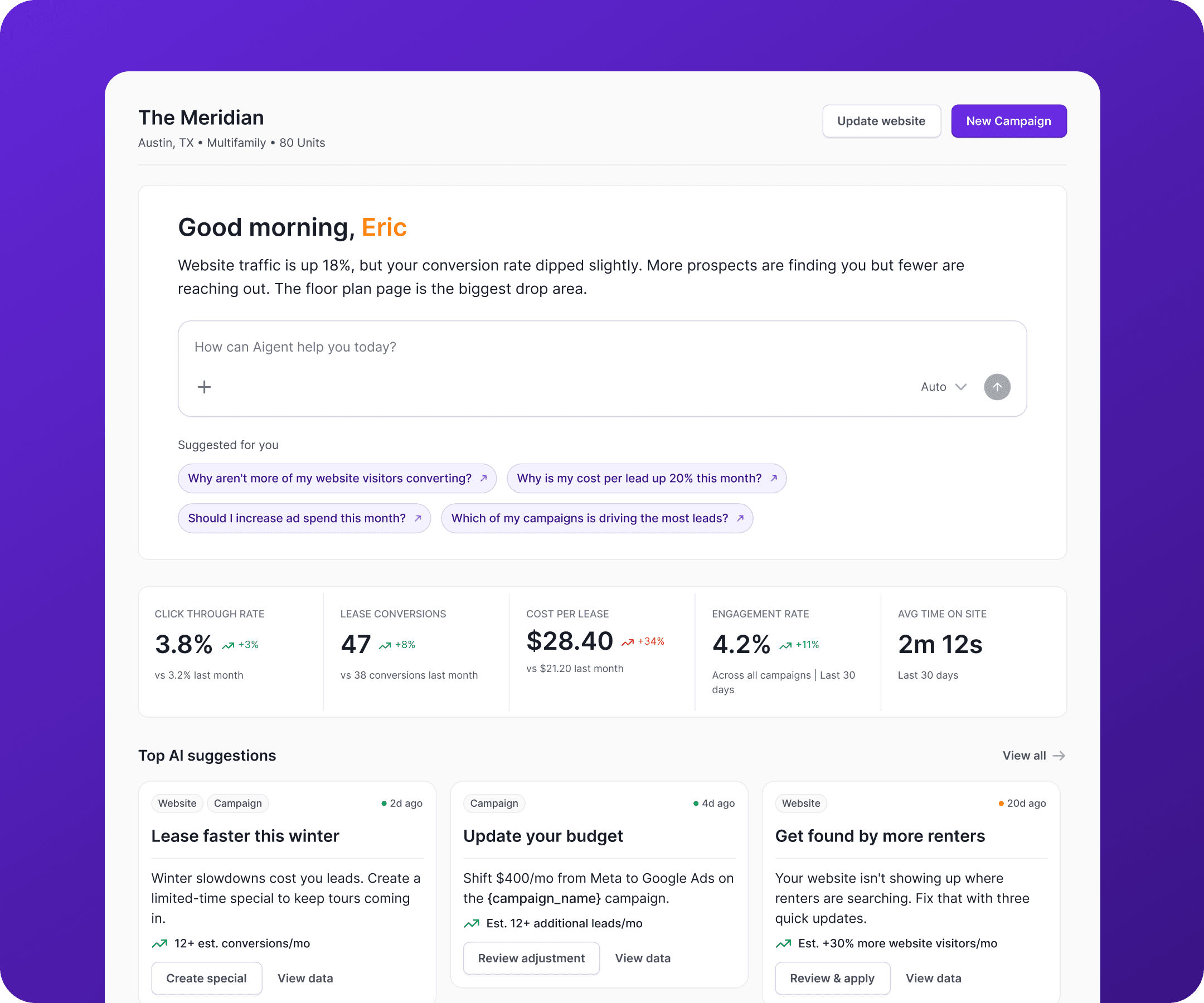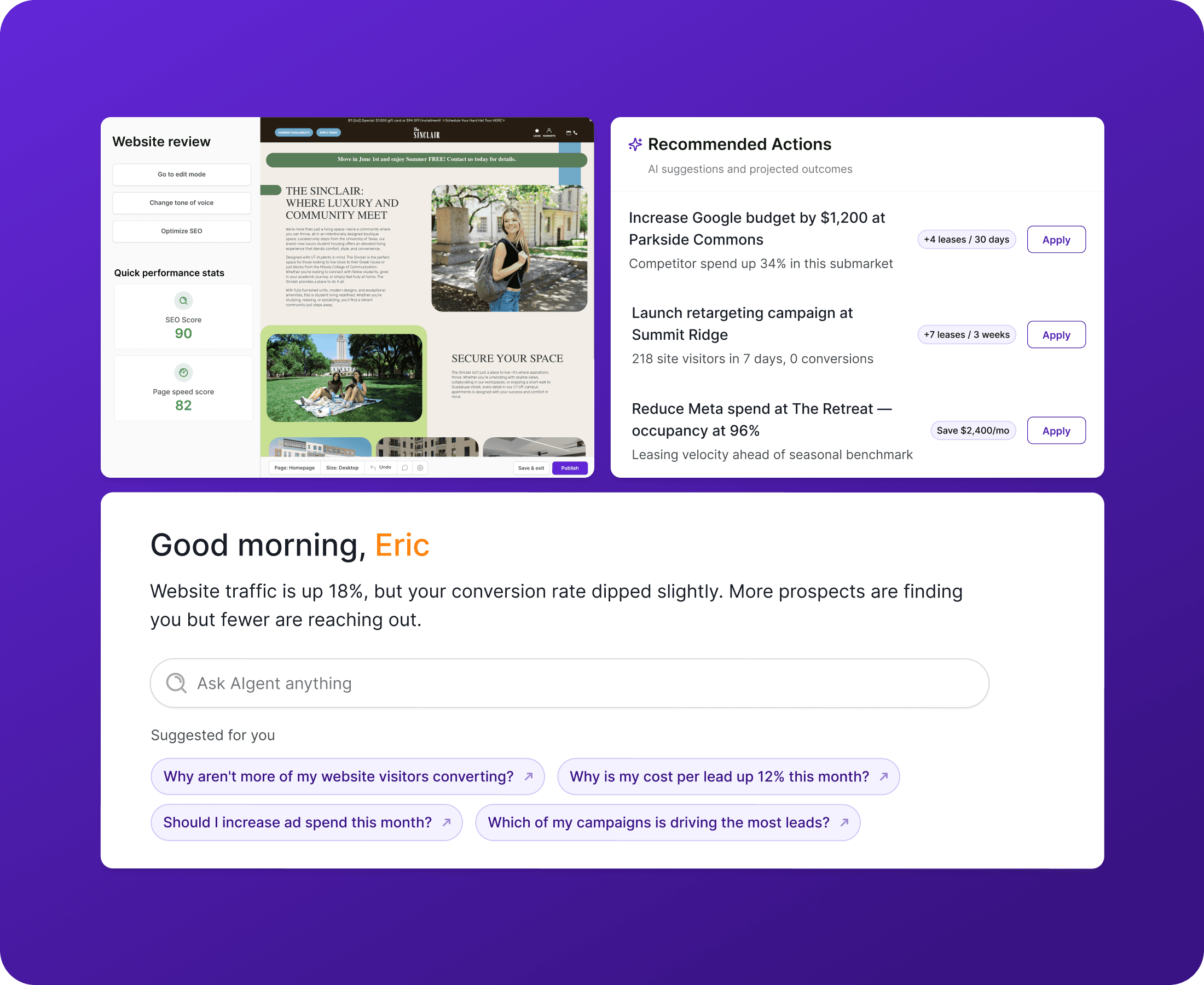 The most strategically significant work Monico did on AIgency was defining how the AI itself should behave and be experienced. Working directly with AIgency's ML and engineering teams, Monico identified the key capabilities the AI should surface to users, determined how and when to intervene with recommendations, and designed the system that translates machine decisions into plain-language actions a property manager can act on with confidence. Every AI recommendation in the product is tied to a measurable outcome (signed leases, saved ad spend, improved occupancy) and explained in terms of why it was generated. The homepage dashboard became the product's north star: a single view that gives operators full visibility into what their AI is doing, why, and what to do next.