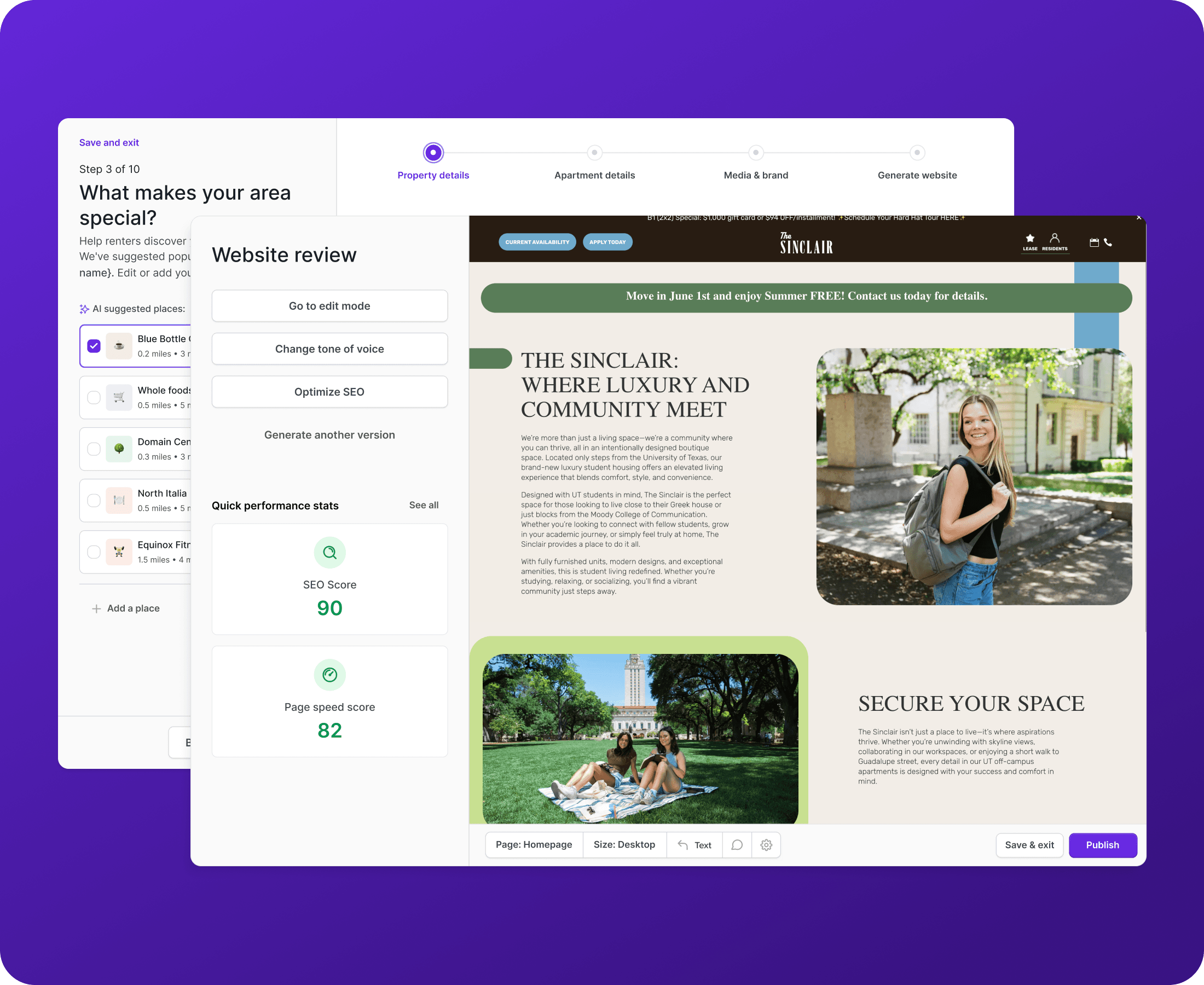 Traditional property website creation takes 30 to 90 days through a marketing agency. Monico designed a guided input flow where property managers enter details about their property once, and AI handles the rest: pulling live data from their PMS, generating copy tailored to their property type, market, and target demographic, and producing a fully branded website ready to publish. The design made a technically complex process feel simple, with the user in control at every step without needing to understand what was happening under the hood.