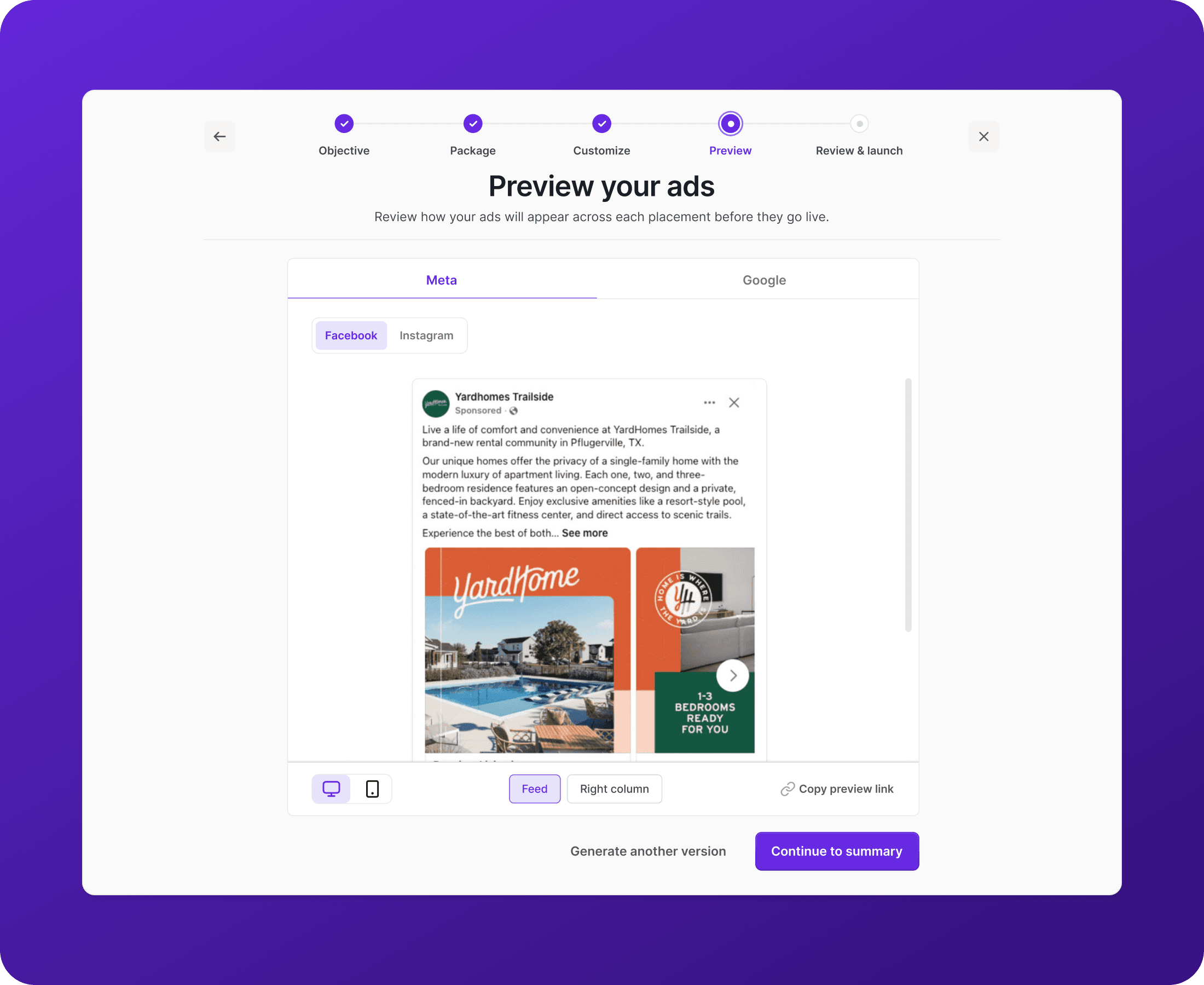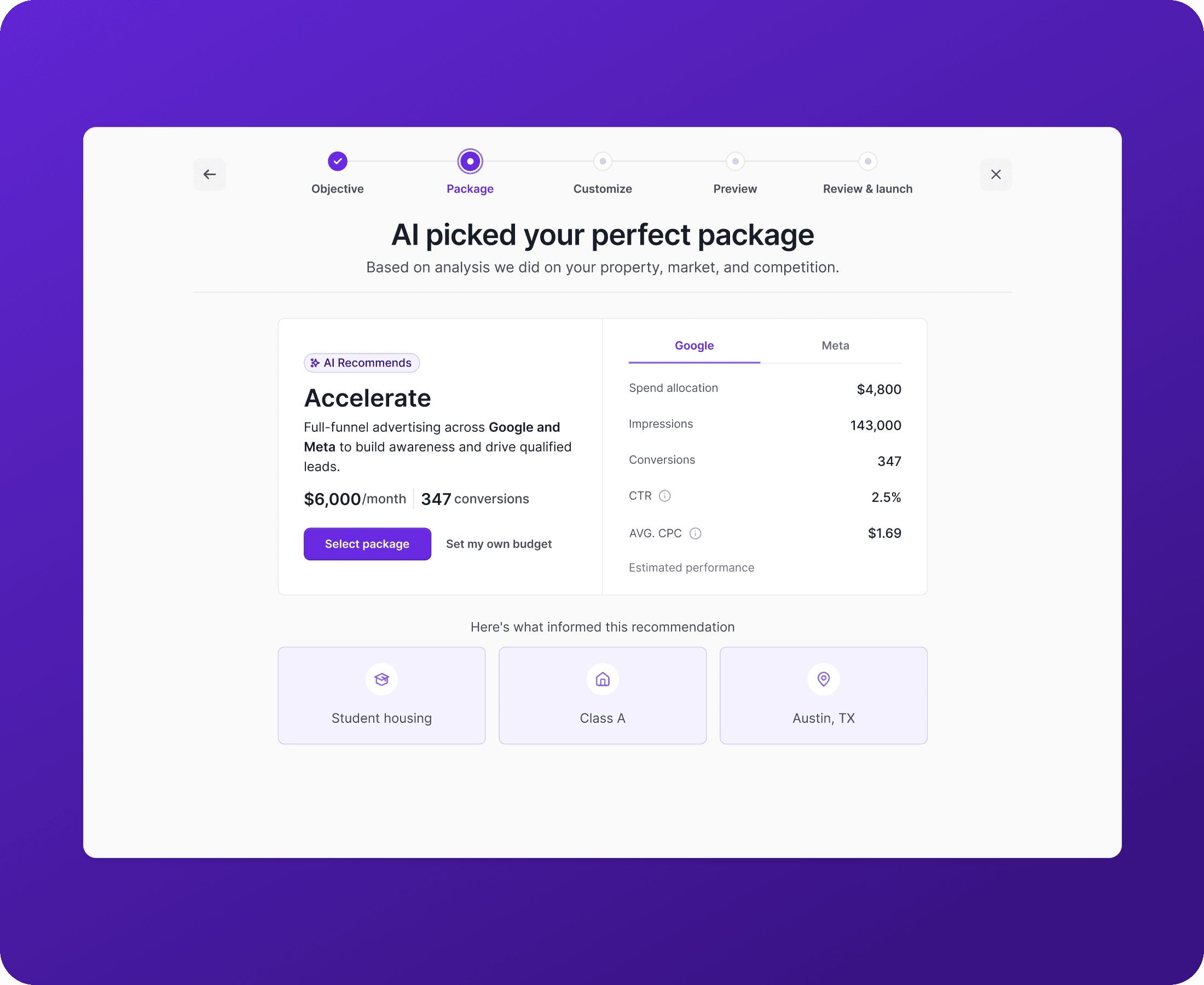 Monico designed the campaign creation flow for AIgency's most operationally complex feature: an AI that takes a property manager's occupancy goals and autonomously builds, launches, and optimizes campaigns across Google and Meta. The design had to abstract serious technical complexity while keeping the user meaningfully in the loop. The result is a goal-first flow where users define what they want (more leases, lower cost per lead, filling a specific property by a specific date), and the AI handles channel selection, creative generation, bid strategy, and ongoing optimization without requiring any paid media expertise from the user.